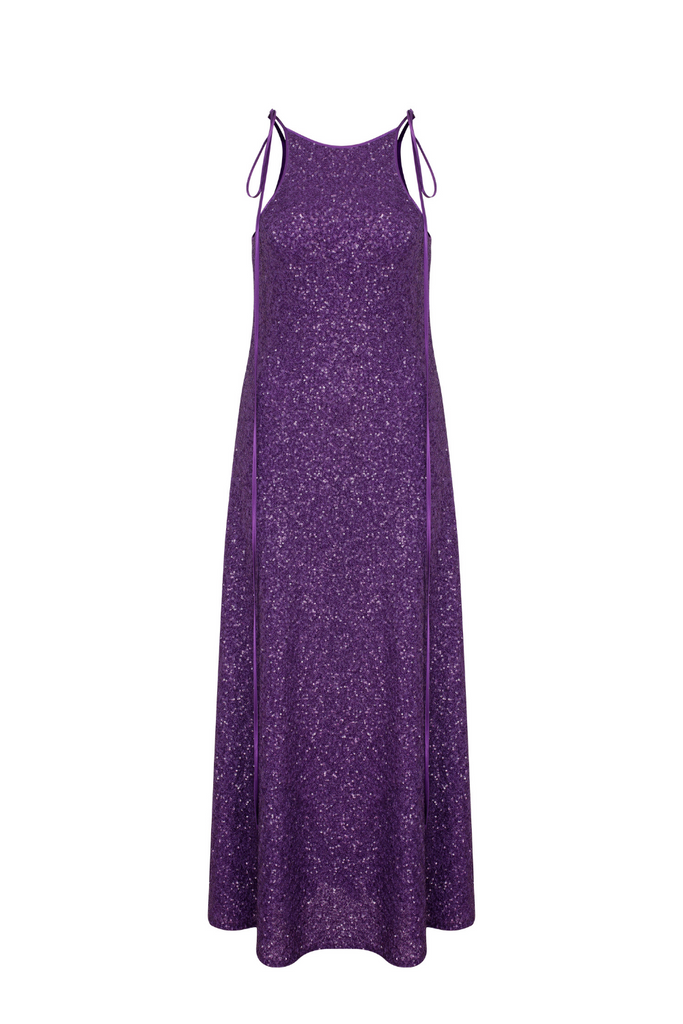 Add a touch of elegance to your wardrobe with our Addie Satin Long Dress in Sparkling Grape. Made with relaxed sequin, this dress is perfect for any special occasion or cocktail party. Let this stunning piece shine and make a statement at your next event.