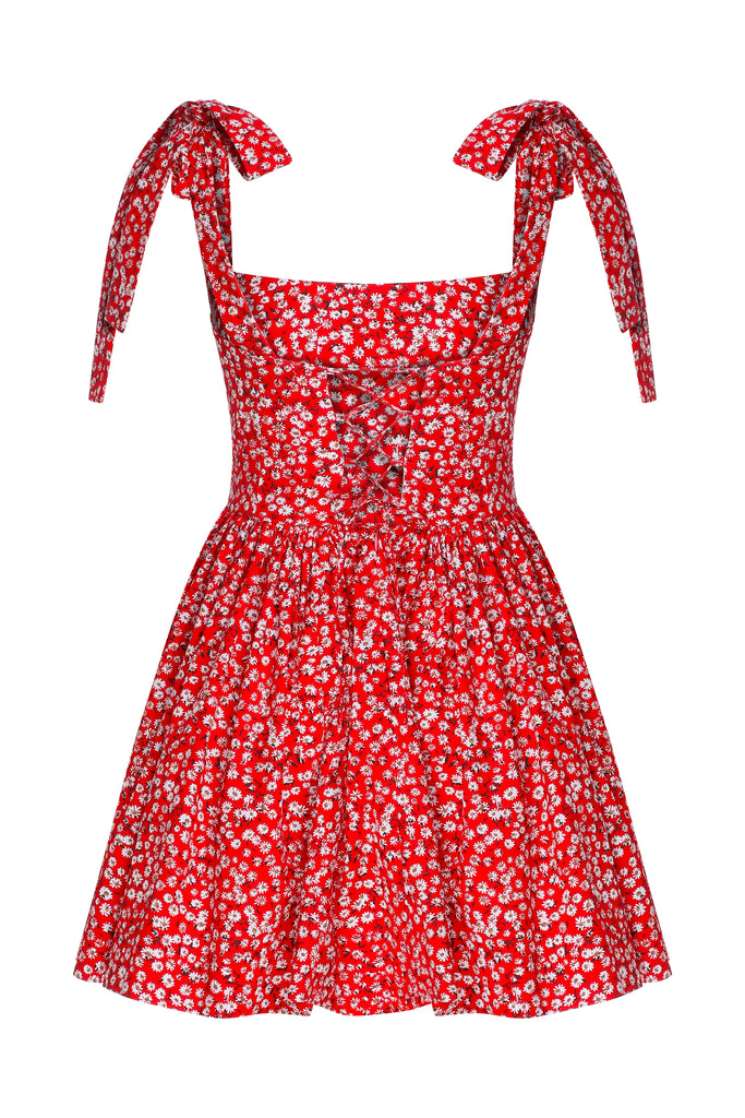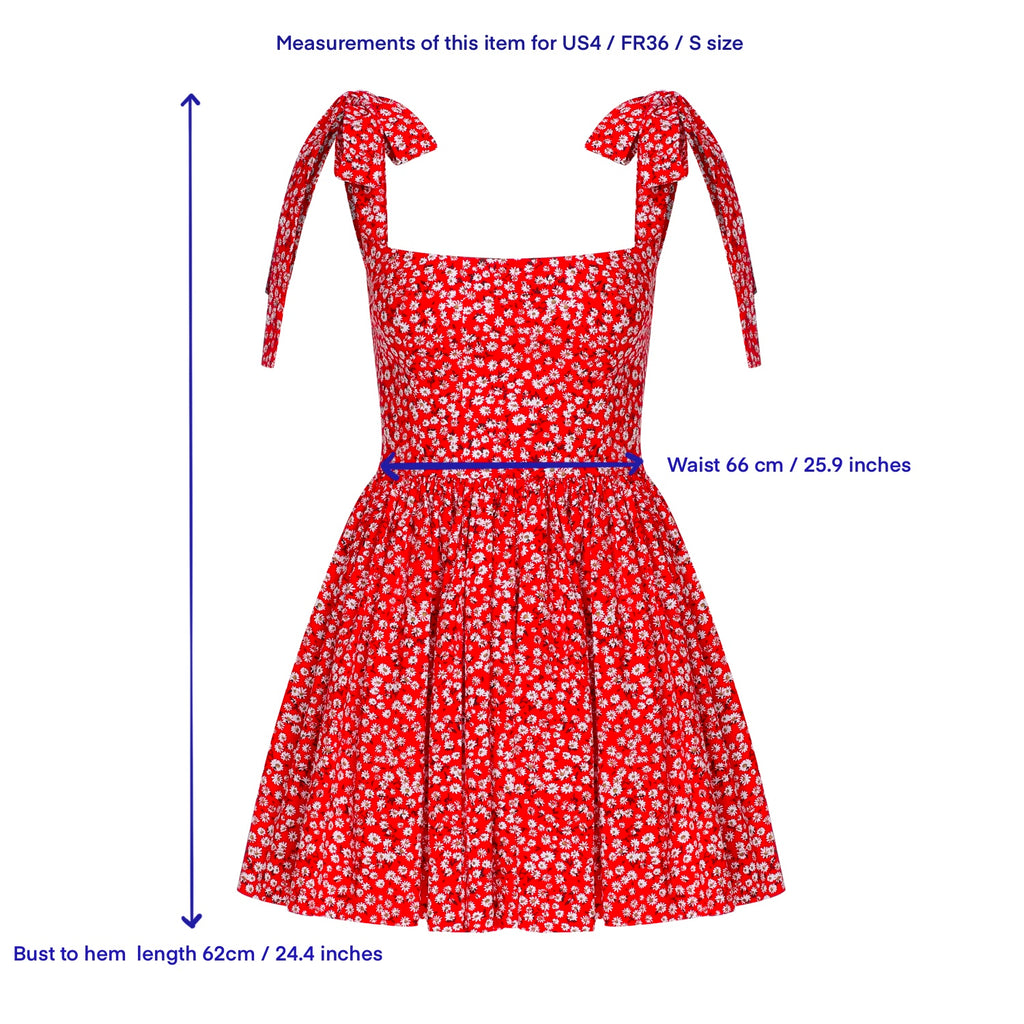 Audree dress is crafted to a signature voluminous shape from breezy poplin that’s printed red florals, features square neck, shoulder ties, and adjustable slender back ties.
