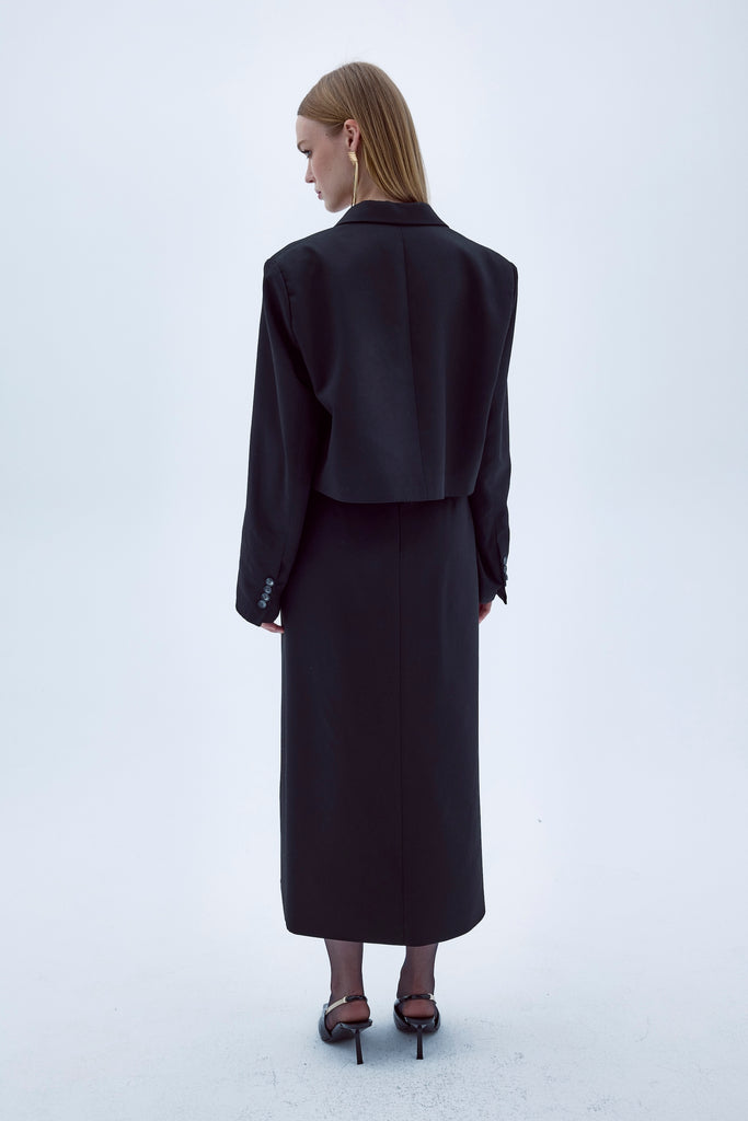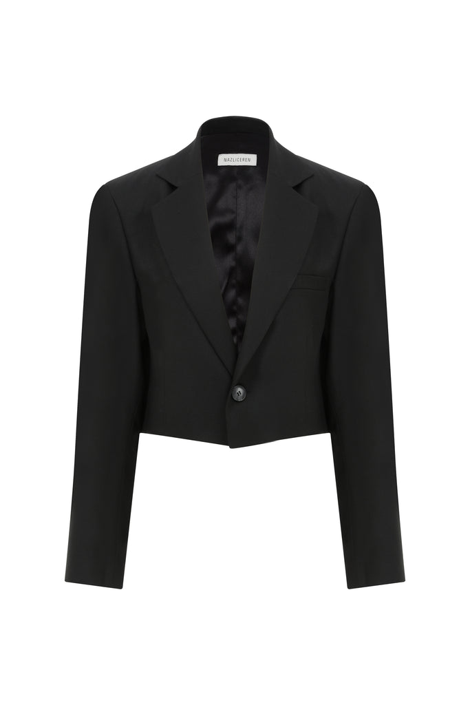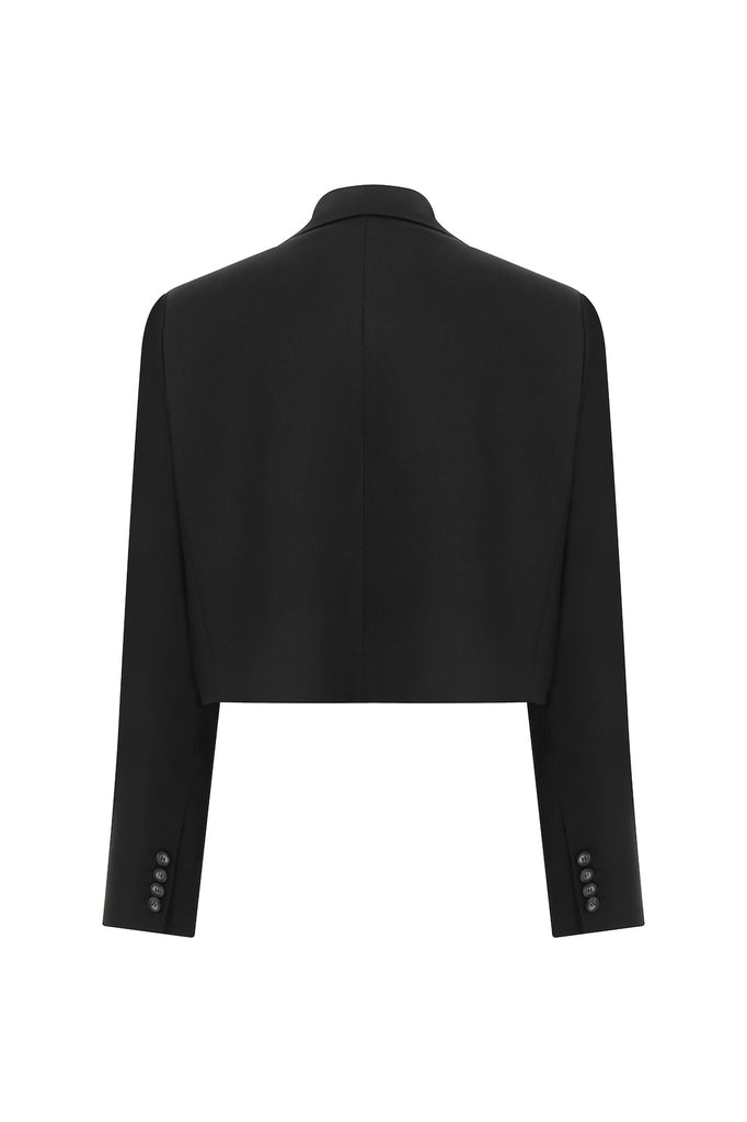 This Boxy Jacket is crafted from soft black cotton, designed with a cropped, oversized silhouette for a modern edge. Featuring padded shoulders, it offers a bold yet versatile look. Perfect for layering, this jacket effortlessly combines contemporary style with a sleek, minimalist aesthetic.