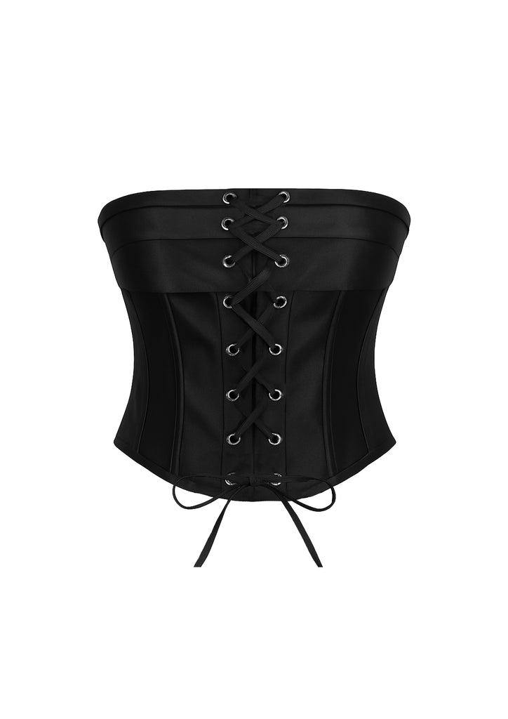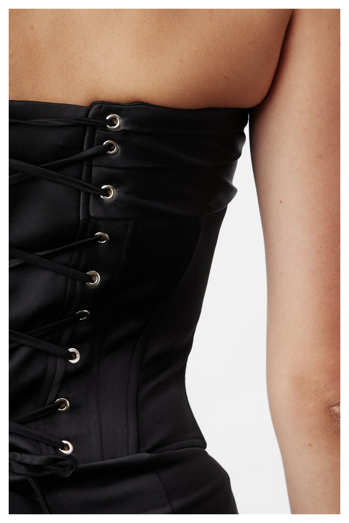 The Bridget Corset is crafted from black satin and features a structured fit with a criss-cross tie construction at the back, creating a sleek, body-hugging silhouette. Styled as a set with the Arced Trousers, made from the same fabric, for a refined look.