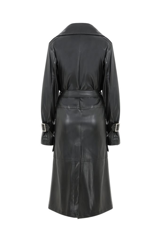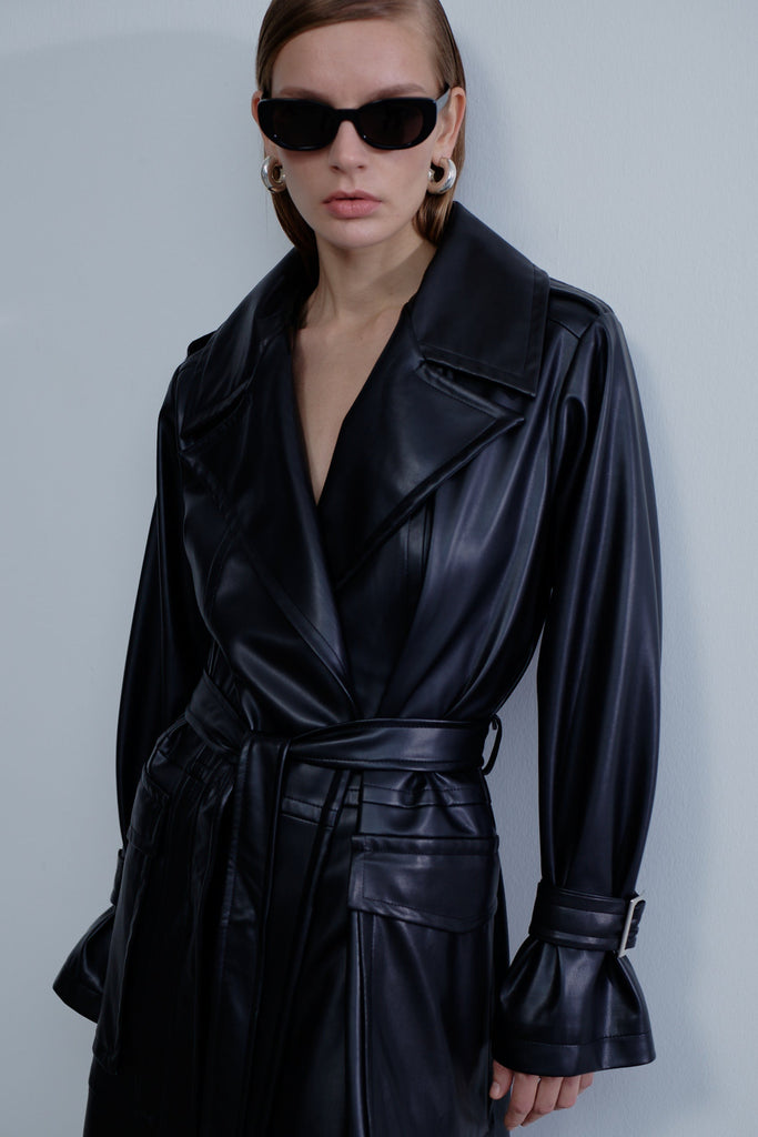 Nazlı Ceren's trenchcoat is crafted from vegan leather. It's designed with a relaxed shape that's enhanced by wide sleeves.Cecile trenchcoat embodies the label’s sophisticated vision.
