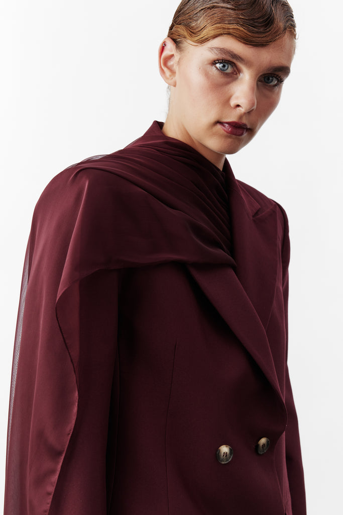 The Elodie Jacket features a double-breasted design with a chiffon fabric detail emerging from the inner lapel for a sophisticated touch. Fully lined for comfort, this jacket in a rich burgundy hue creates a strong silhouette. Styled in the collection with the Marde fabric skirt or Arced Trousers in bordeaux.
