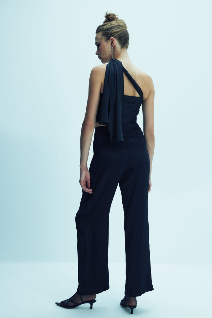 Look stunning in the Evelyn jersey blouse. Crafted from breathable jersey, this asymmetric design features a wrap blouse detail. Complete with a black hue, the blouse fits like a dream and looks perfect with Tina satin trousers.