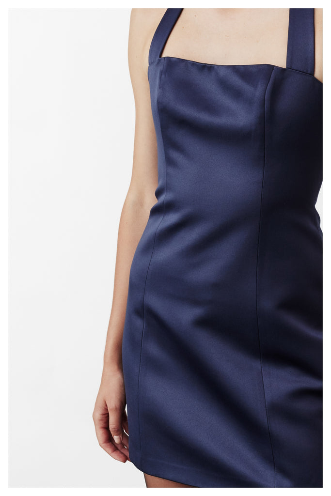 The Hadley Mini Dress is crafted from matte satin and fully lined with satin for both elegance and comfort. Its structured, slightly heavier satin fabric maintains its shape while flattering the silhouette. Designed with a modern halter neck and mini length, this style is also available in turquoise.