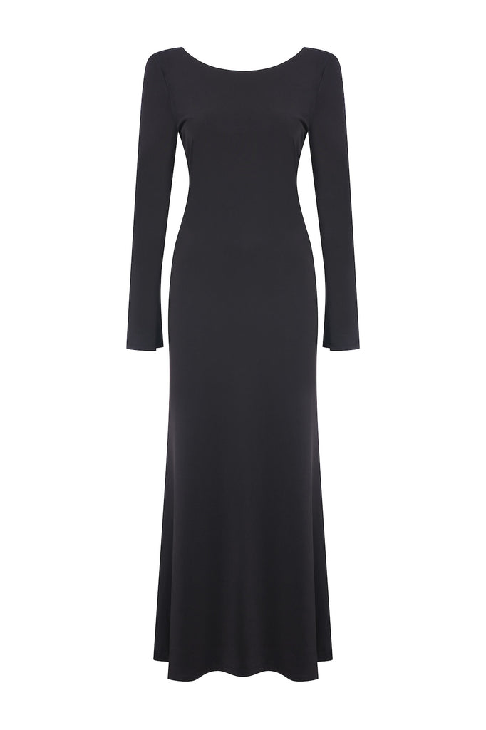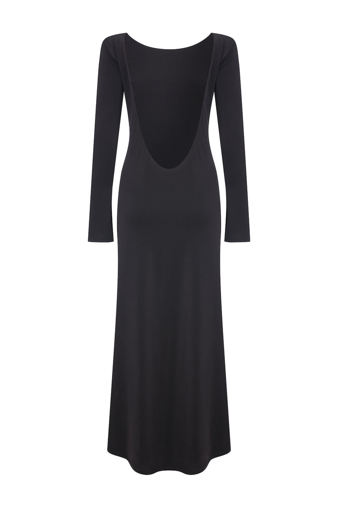 The Irıs Dress is crafted from soft jersey fabric in black, designed with a sleek open back and elegant long sleeves. This long dress offers a versatile silhouette that can be styled with belts for a personalized fit. Perfect for both formal and casual occasions, the IRIS Dress effortlessly blends comfort with sophistication, making it a timeless addition to any wardrobe.