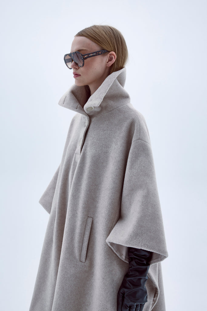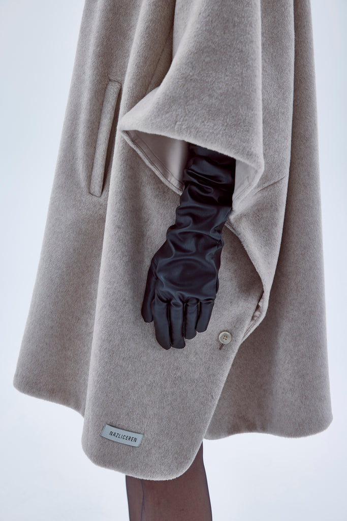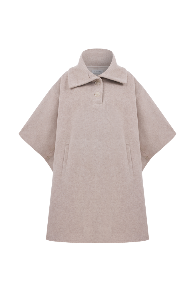 Nazlı Ceren crafts the Jarine Poncho in warm camel tones from a soft wool blend fabric, making it the perfect layering piece for any season. Designed with a buttoned collar for added style and comfort, this poncho effortlessly combines elegance and versatility, offering a chic solution for transitional weather.