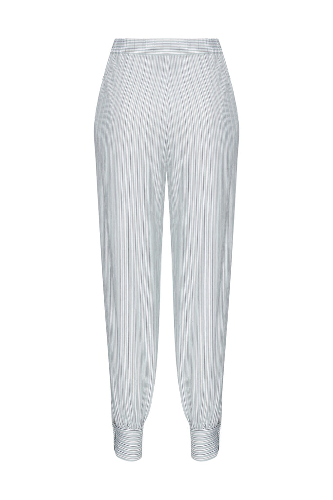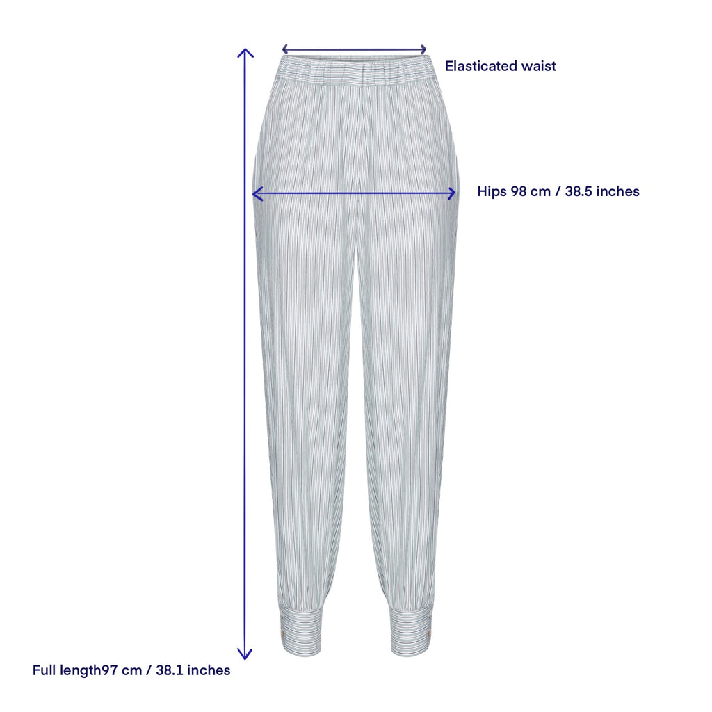 Maith Cotton Striped trousers feature a high elasticated waistband, side pockets, front zip closure, and tapered design with buttoned cuffs. Perfect company for summer events with matching Myra Cotton waistcoat or blouses.