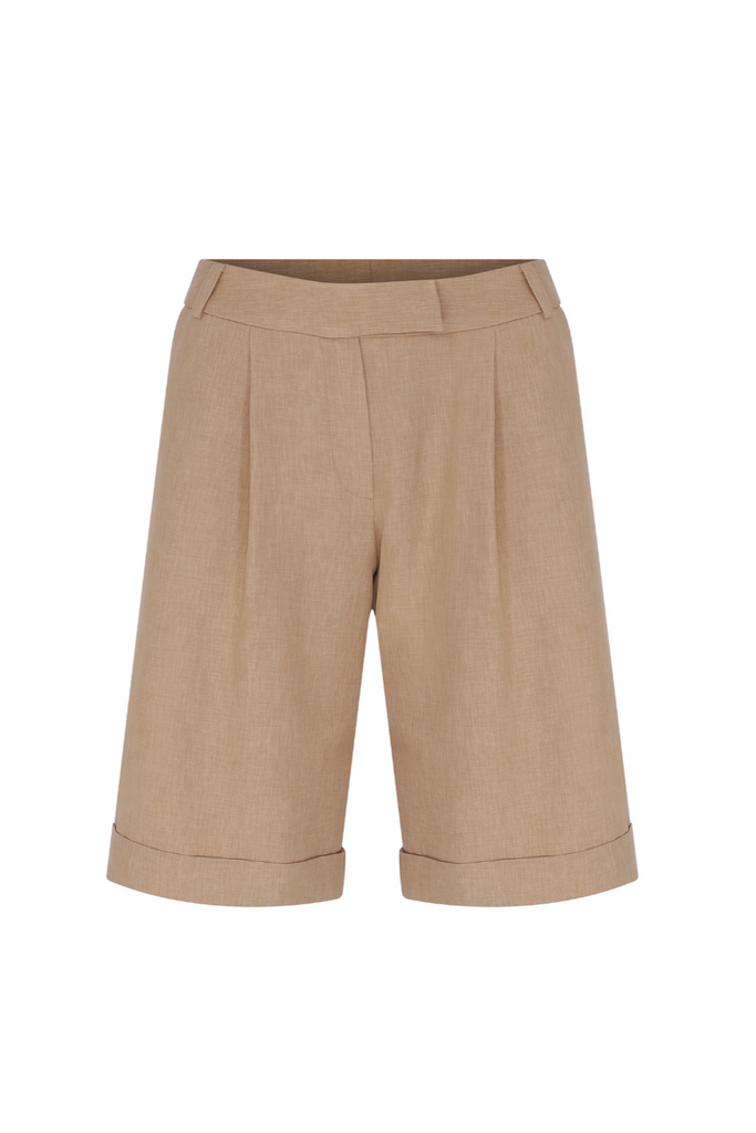 Nazlı Ceren's Marde Almand Buff shorts, which are pressed with a reverse-pleated rise to accentuate the wide legs. They’re crafted from linen-blend cotton for a smooth handle, then finished to a high-rise silhouette with back-flap pocket.
