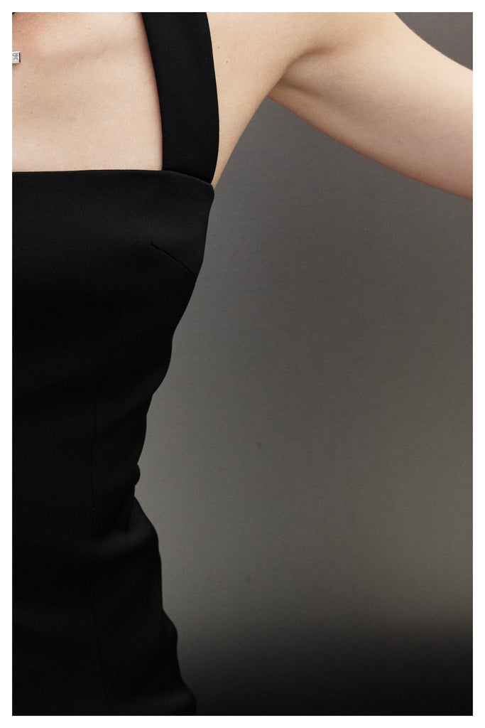 The Margaux Dress, crafted from crepe fabric, combines elegance and comfort with its fully body-hugging fit and satin lining. Featuring a halter neck design and back slit, it offers a refined silhouette perfect for cocktails and special evenings. A shorter version is also available.