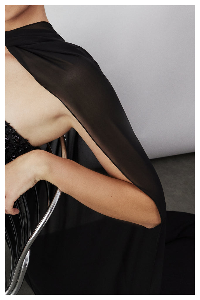 The Reya Chiffon Cape features a twisted neckline and an elongated back for an elegant silhouette. Its draped design over the shoulders creates a dreamy effect, making it a sophisticated piece to elevate any look.