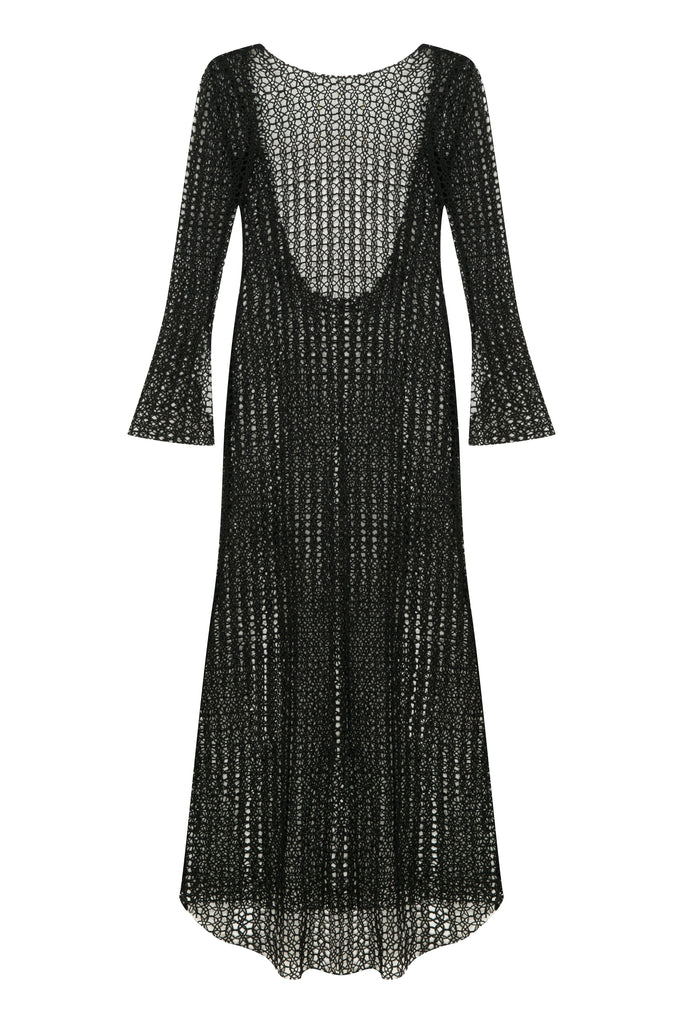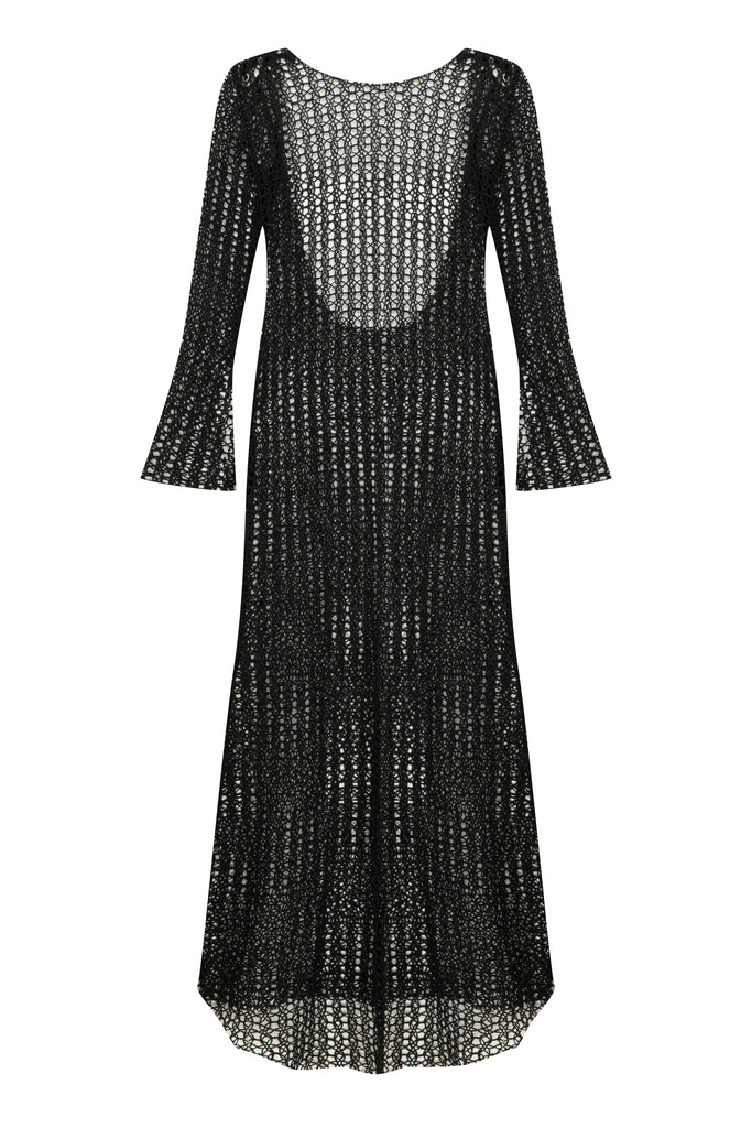 Stay bright in the Riona Open-Back Crochet Long Dress in Black. This sophisticated dress features intricately detailed open-back and crochet designs for a luxe look. The satin-like fabric and long length provide a classic silhouette and effortless comfort. Get ready for any occasion in the perfect hue of black.