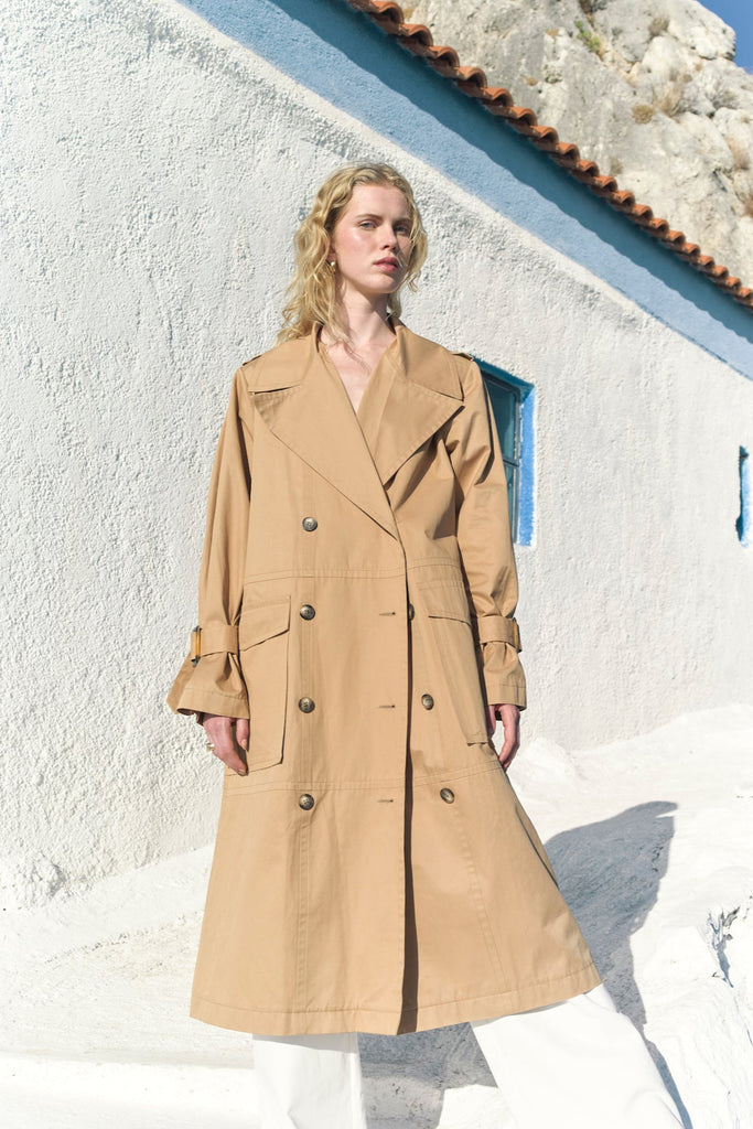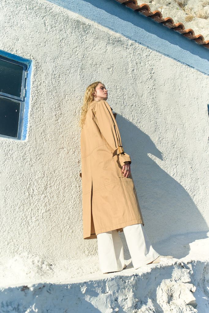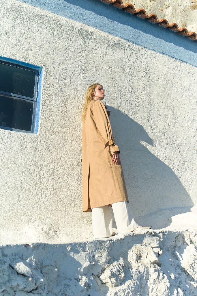Nazlı Ceren’s take on the classic trench coat sees this camel iteration shaped with a billowing rain guard that adds fullness to the sleeves – cinches them at the wrist to accentuate the effect. Crafted from crisp cotton poplin, it has an exaggerated gun flap, flared midi hem and a sash at the waist.