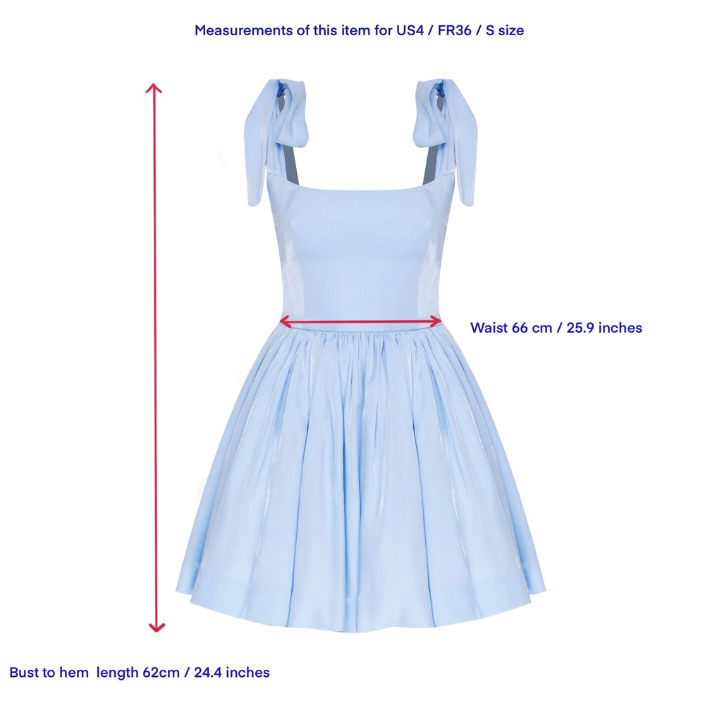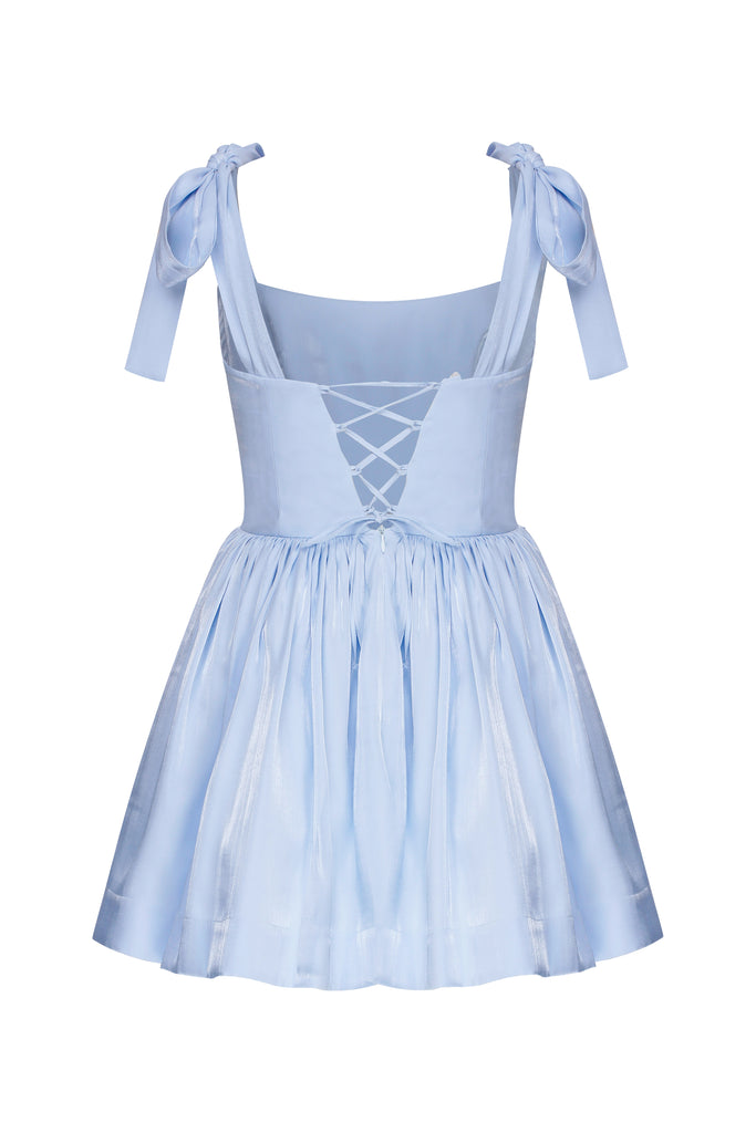Nazlı Ceren strikes a poetic note with this blue shiny viscose mini dress, which is shaped with draped shoulder ties and a gathered skirt.