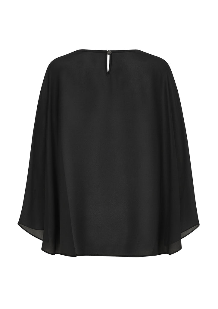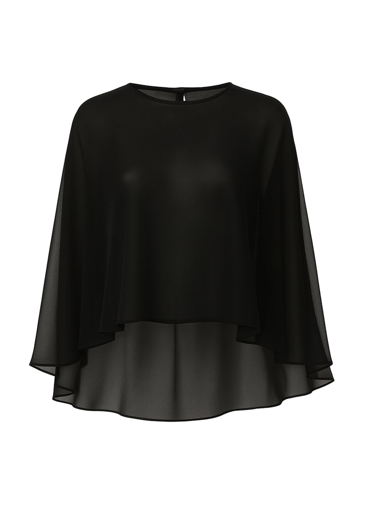 The Viona Cape is crafted from black chiffon with a sheer finish, offering an elegant and modern look. Designed shorter in the front and slightly longer at the back, it pairs perfectly with bustiers and crop tops.