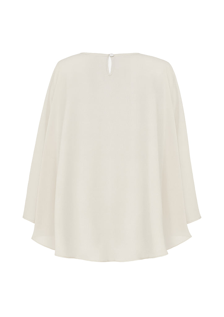 The Viona Cape is crafted from beige chiffon with a sheer finish, offering an elegant and modern look. Designed shorter in the front and slightly longer at the back, it pairs perfectly with bustiers and crop tops.