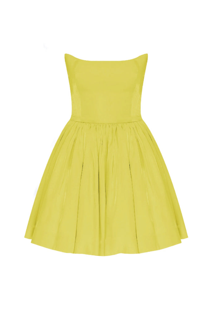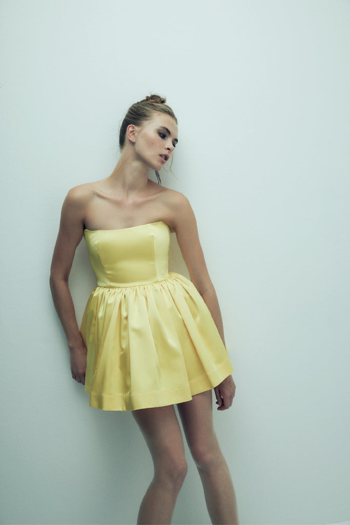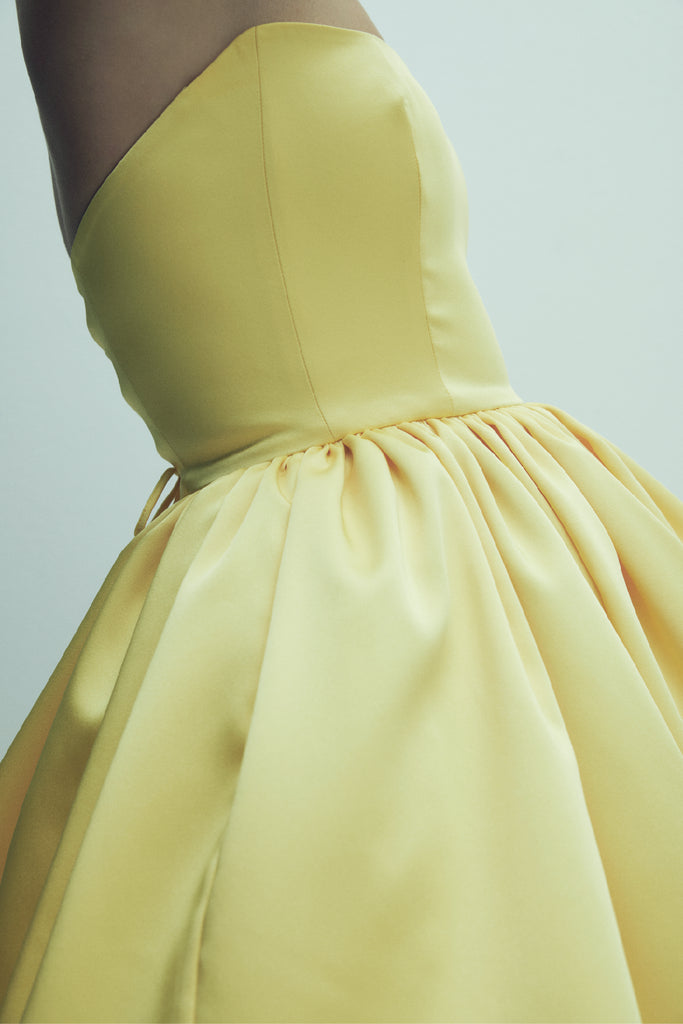 Crafted from lightweight satin, Nazlı Ceren's marigold mini dress is shaped with a fitted strapless bodice and softly scalloped edges.