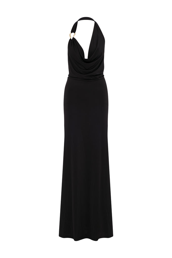 The Dakota Long Jersey Dress in black is a stunning piece crafted from luxuriously soft jersey fabric, offering a graceful drape on the decollete and comfortable fit. The dress features an exquisite gold accessory at the front, adding a touch of refined elegance. With a captivating open back, it effortlessly balances sophistication and allure, making it the perfect choice for evening soirées or special occasions.