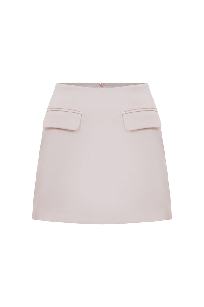 The Marde A-Line Skirt features stylish patch pockets and is crafted from soft matte satin, lined with silky satin for a luxurious finish. With a mid-waisted cut, this skirt offers a flattering silhouette and pairs perfectly with the Elodie Blazer in cloud pink for a coordinated and elegant look, suitable for any occasion.
