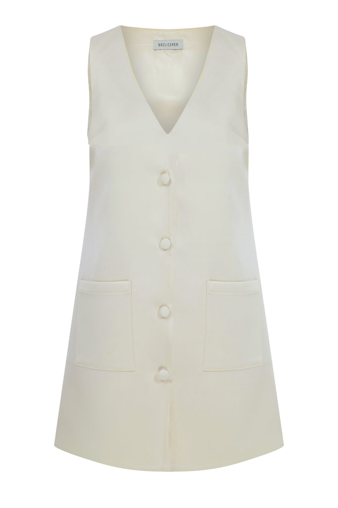 The Odessa Mini Dress is crafted from luxurious crepe fabric in a beautiful vanilla ice hue. Featuring a flattering V-neck and buttoned front, this stylish piece is a bestseller, perfect for elevating your wardrobe for any occasion.