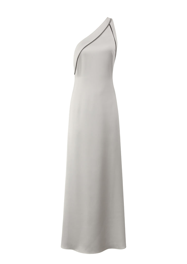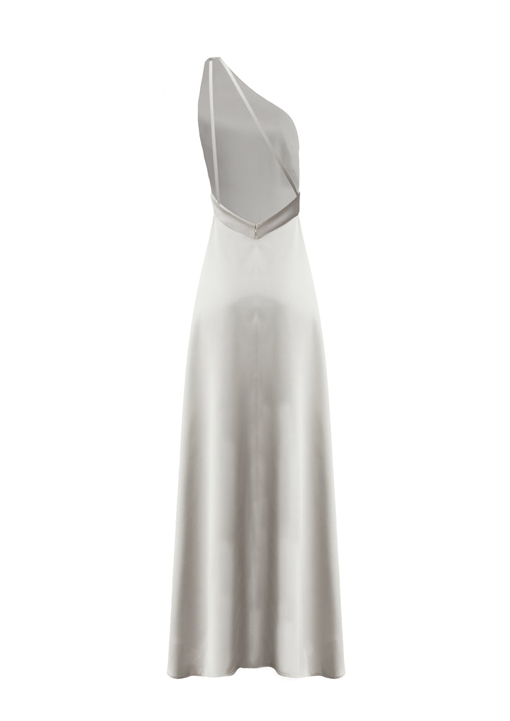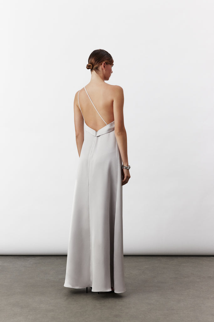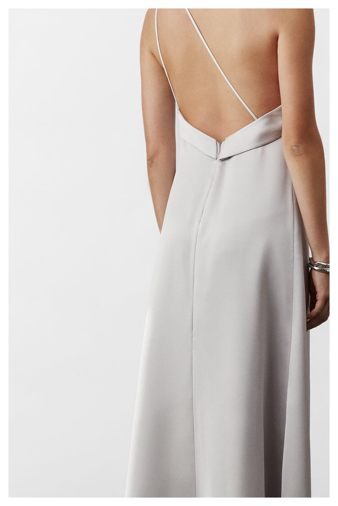 The Aime Long Satin Dress stands out with its asymmetric neckline and one-shoulder design. Twin straps extend from the front shoulder and fasten at the back waist, adding a distinctive and sophisticated detail. Fully lined in satin, it offers both comfort and elegance.