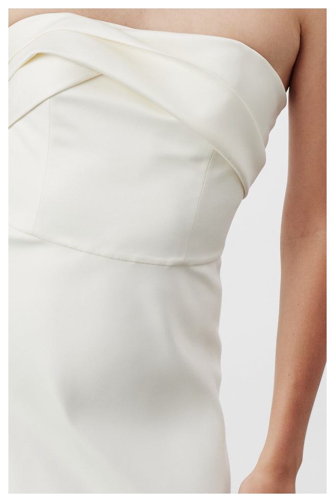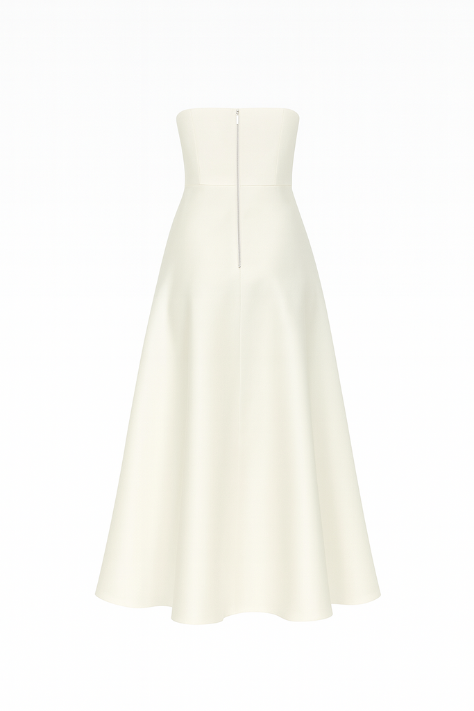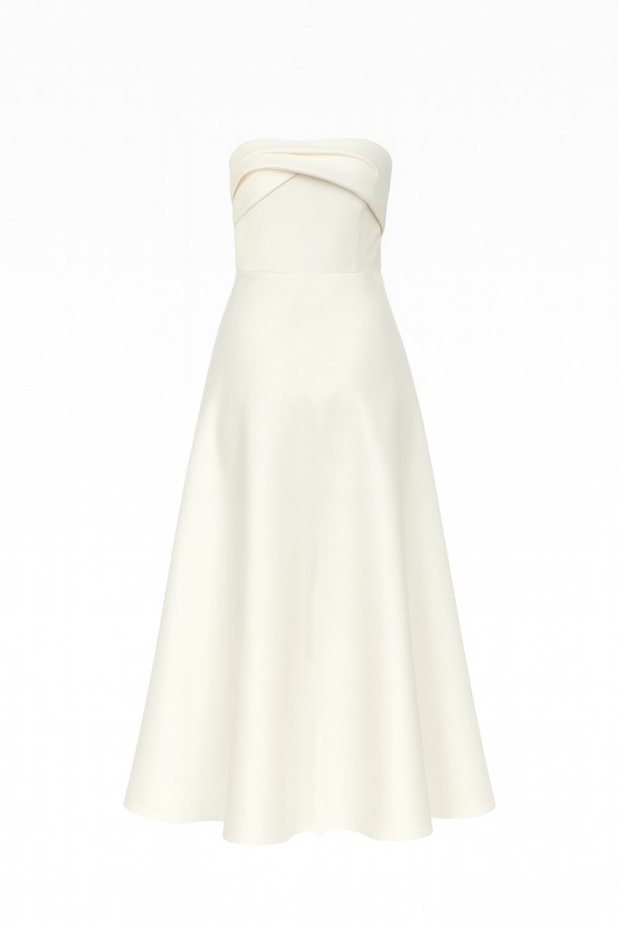 The Freya Midi Dress offers a refined balance with its fitted bodice and relaxed skirt. It's crafted with a double layer of its own fabric, while the pleated detail on the bust adds a delicate and unique touch of elegance. Featuring a strapless design with a back zipper, the dress falls to ankle length. A shorter version is also available.