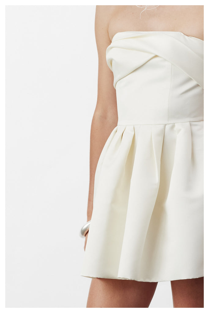 The Freya Mini Dress features a delicate and unique elegance with its pleated bust detail. Designed strapless with a back zipper, it creates a modern silhouette. The pleated skirt and double-layer construction in its own fabric add both volume and sophistication. Fits true to size.