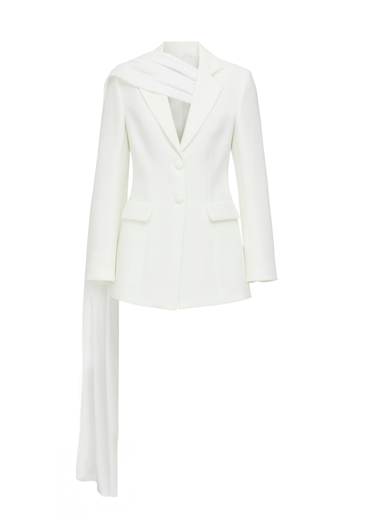 The Marylebone Blazer features a fitted waist and body-hugging silhouette for a powerful look. Crafted from crepe fabric, it is enhanced with a chiffon detail emerging from the inside for an extra sophisticated touch. It can be styled with the Arced white crepe trousers or the Tina trousers for a modern, refined appearance.
