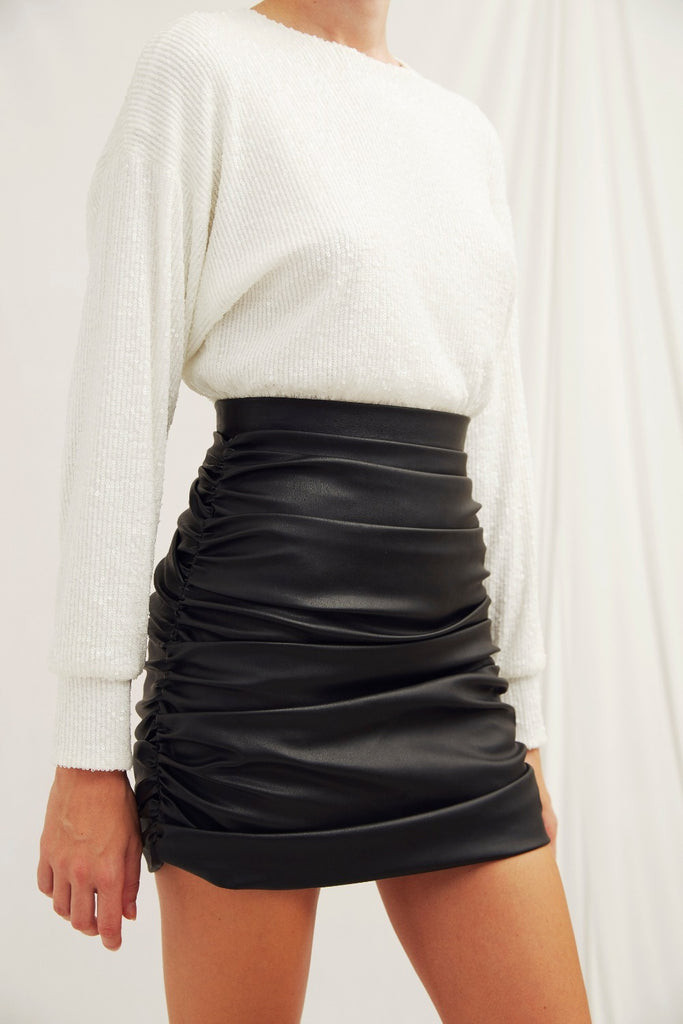 Chels Ruched Vegan Leather Mini Skirt in Black