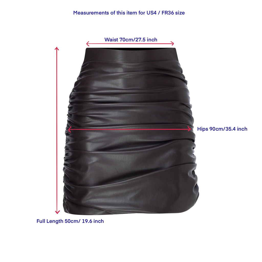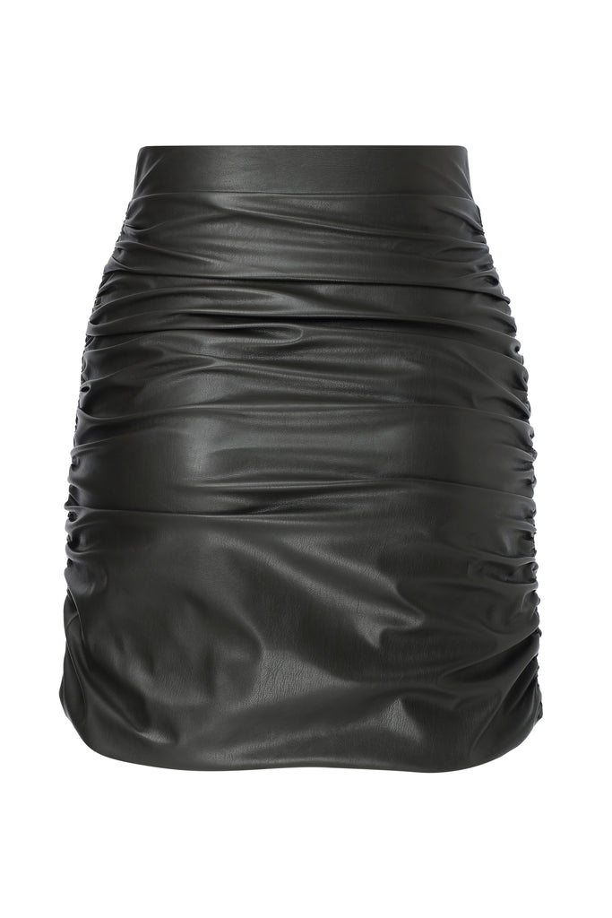 Chels Mini skirt is evocative of the label’s free-spirited aesthetic. It’s crafted from black vegan leather that’s ruched for a flattering fit and lined with black satin, then fastens with side zip.
