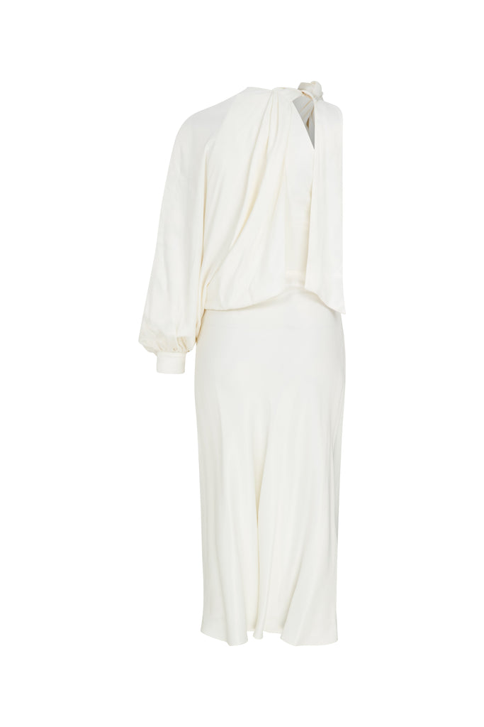 Nazlı Ceren's Emillien dress plays with proportion and sculptural shape, which defines this asymmetric off white satin maxi dress with effortless elegance.