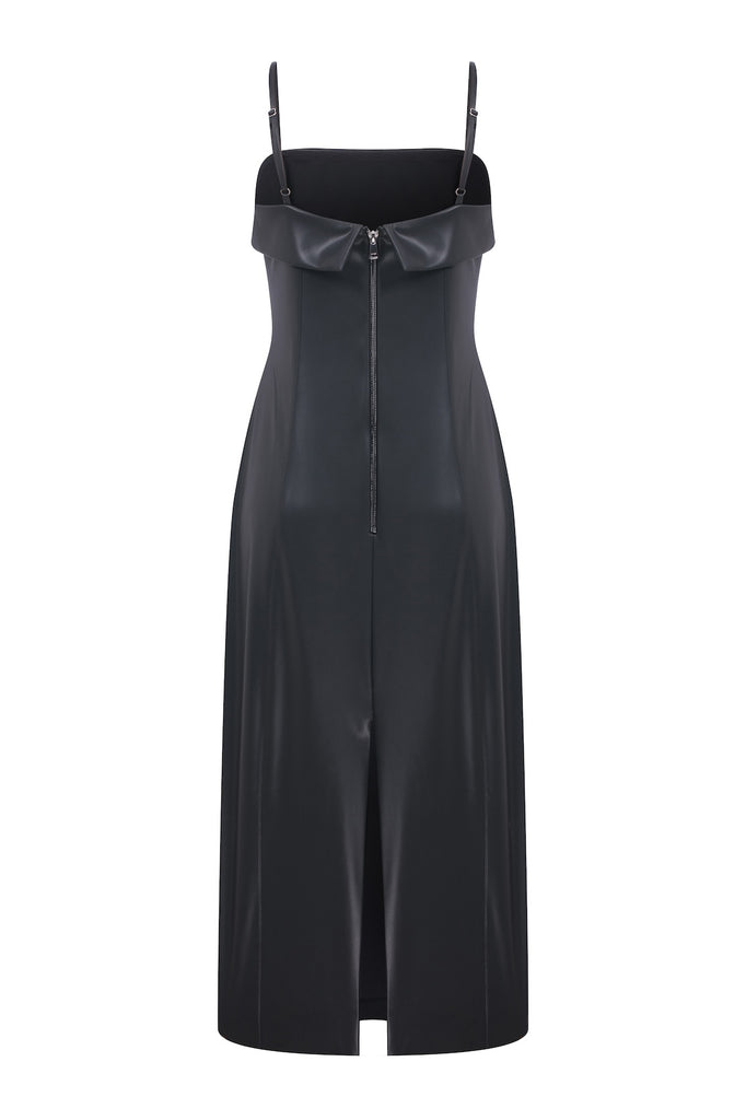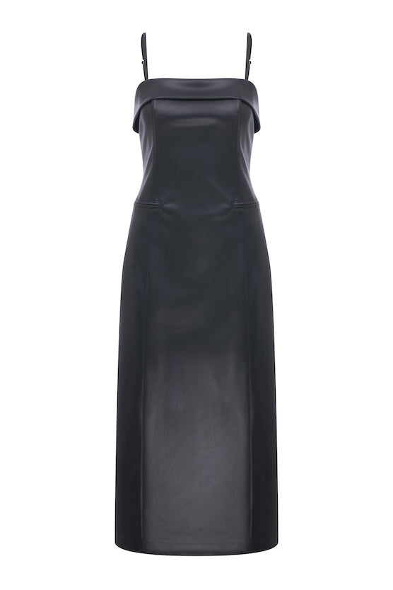 Elevate your style with the Gaia Midi Dress, a stunning reinterpretation of a classic silhouette. Crafted from sleek vegan leather, this dress features modern sophistication. The elegant design is complemented by subtle details, ensuring you make a statement at any occasion.
