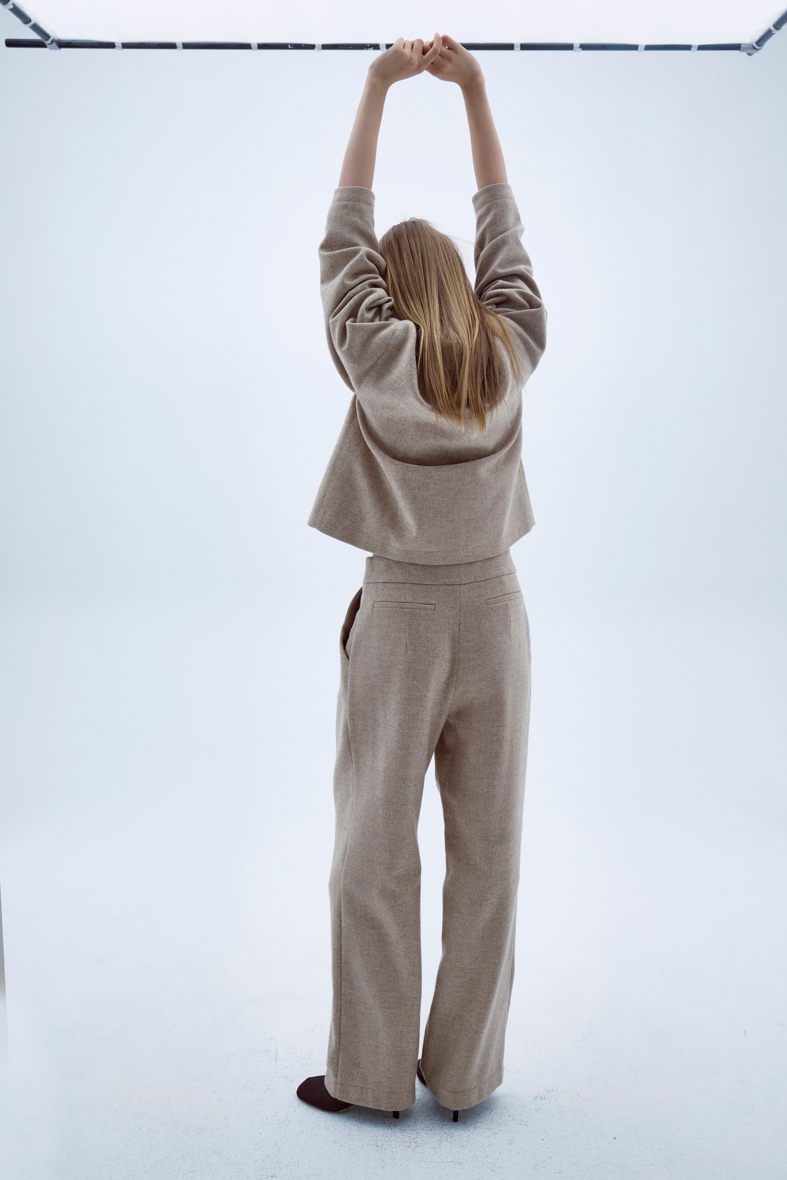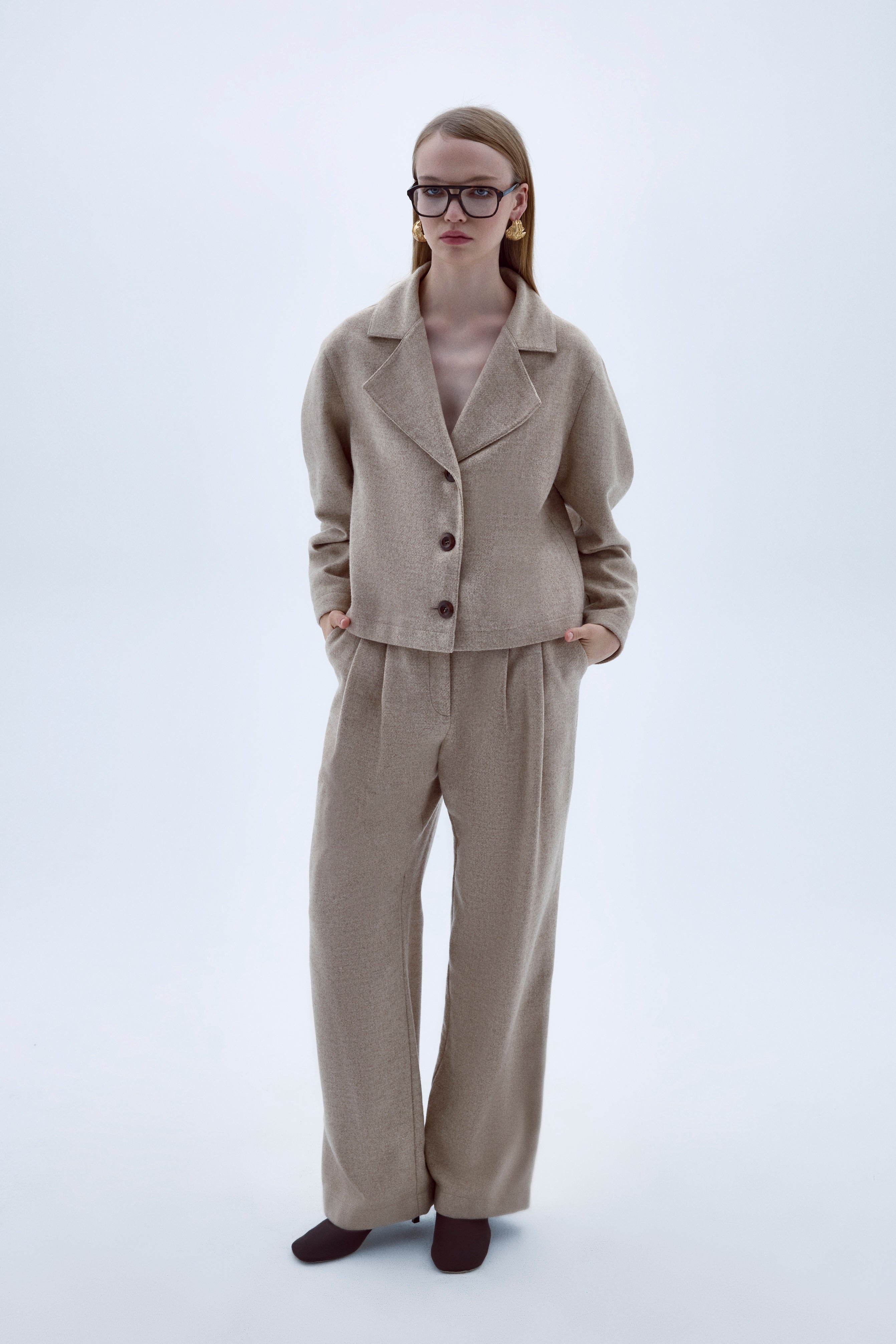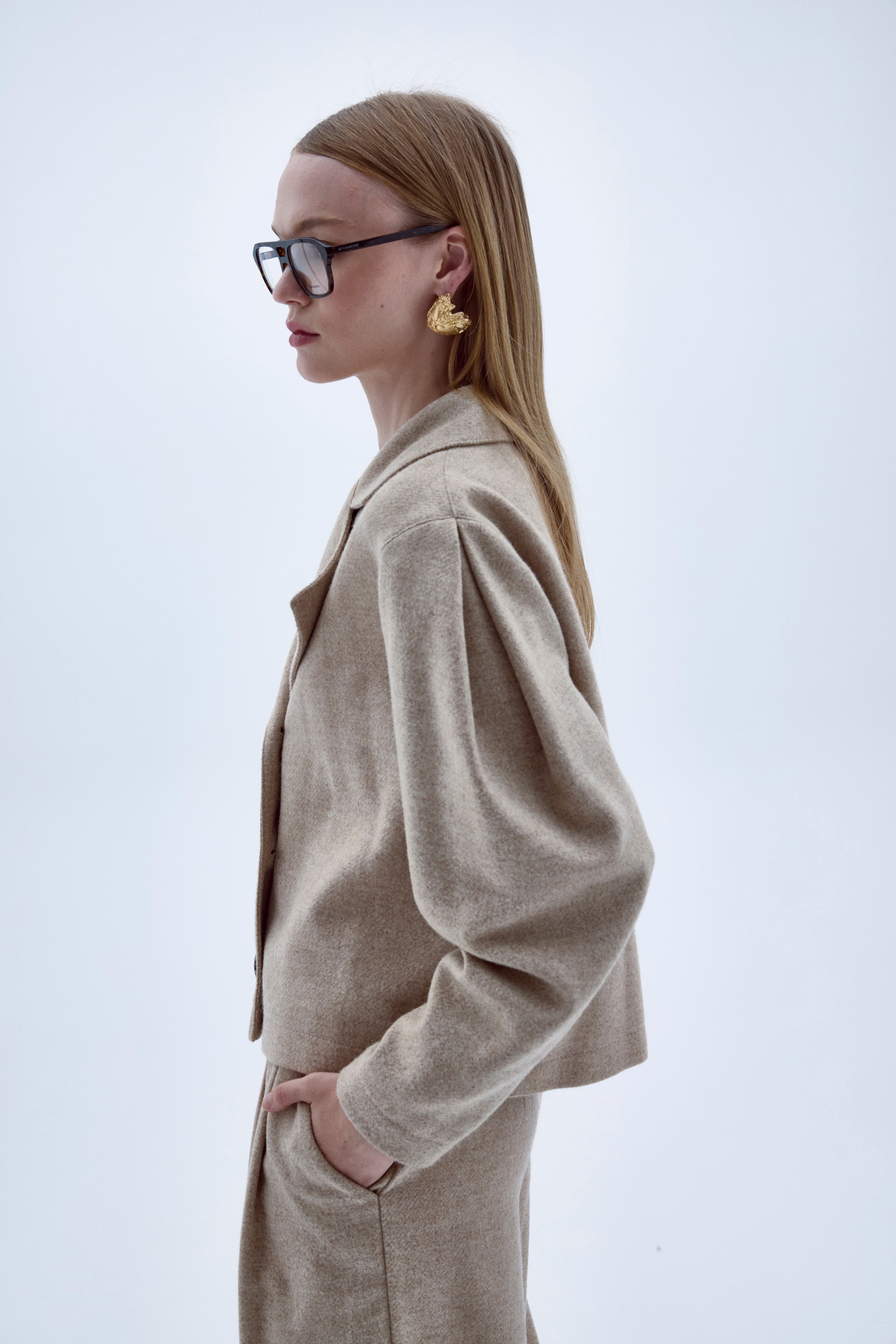 Kai Jacket is made from wool in beige, it features slightly exaggerated and curved shoulders.