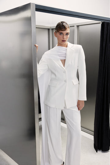 The Marylebone Blazer features a fitted waist and body-hugging silhouette for a powerful look. Crafted from crepe fabric, it is enhanced with a chiffon detail emerging from the inside for an extra sophisticated touch. It can be styled with the Arced white crepe trousers or the Tina trousers for a modern, refined appearance.