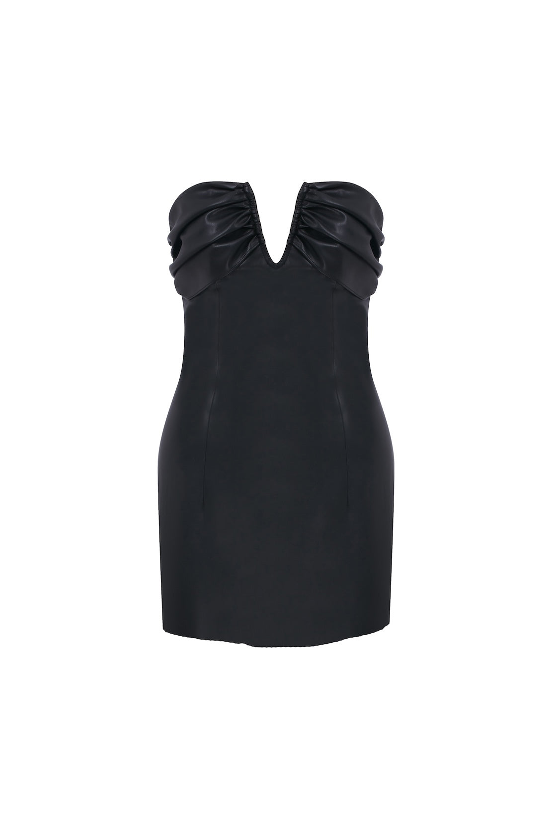 Introducing the Miora Strapless Mini Dress, a bold reimagining of a timeless classic. Crafted from sleek vegan leather, this dress offers a modern, edgy twist while maintaining a chic, structured silhouette. The striking front detail adds a touch of sophistication, making it the perfect choice for turning heads at any event. Confident and stylish, this mini dress is designed for those who love to stand out.