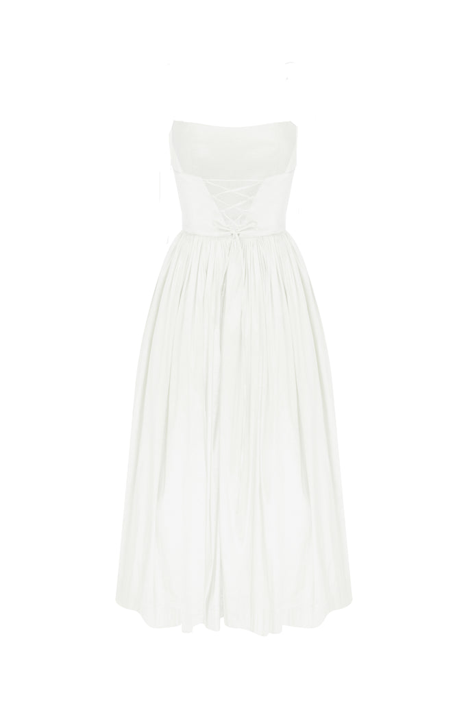 The Sibby Dress is crafted from lightweight satin viscose and represents the touch of elegance. This strapless, midi-length dress boasts an adjustable back for a perfect fit and includes a layer of tulle under the skirt for added volume and flair. Effortlessly chic, the Sibby Dress is ideal for any special occasion.